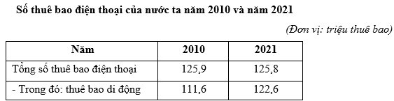 Căn cứ bảng số liệu trên, hãy cho biết giai đoạn 2010 – 2021 số thuê bao điện thoại cố định của nước ta giảm bao nhiêu triệu thuê bao (làm tròn kết quả đến một chữ số thập phân).