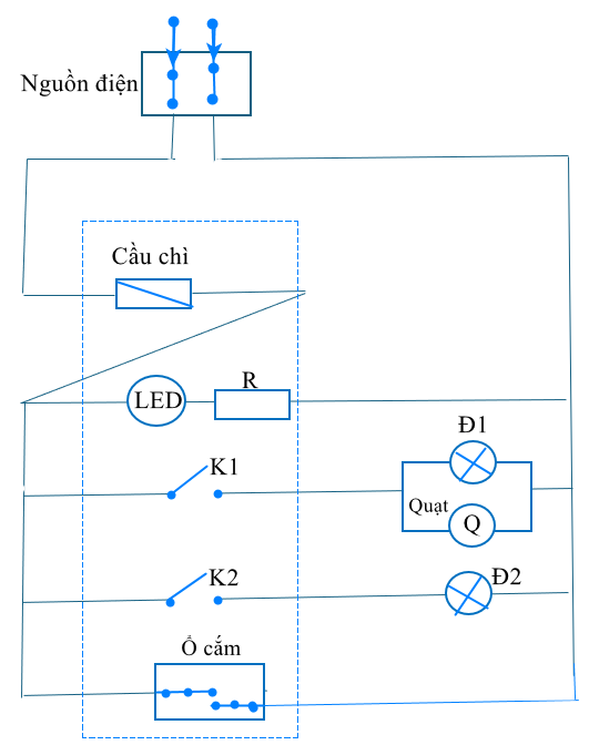 (2,5 điểm) Một bạn muốn thiết kế sơ đồ mạch điện cho một góc học tập. Sơ đồ mạch điện bao gồm các kết nối dây dẫn điện giữa nguồn điện với bảng điện và giữa bảng điện với các thiết bị sử dụng điện (gọi tắt là thiết bị). Trên bảng điện có gắn 02 công tắc, 01 cầu chì, 01 ổ cắm và đoạn mạch gồm 01 đèn led mắc nối tiếp điện trở R (để báo trạng thái sẵn sàng cấp điện của bảng điện) như Hình 3. Các thiết bị gồm 02 đèn, 01 quạt và các thiết bị khác (không thể hiện trên hình) có thể sử dụng điện qua ổ cắm trên bảng điện. Bỏ qua điện trở của cầu chì, của các dây dẫn và của các công tắc.