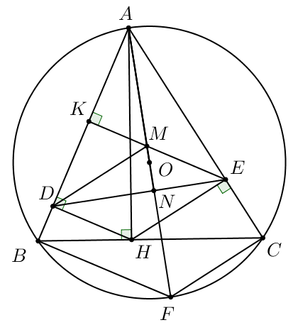 5.2) Cho tam giáo ABC nhọn, có đường cao AH. Đường tròn (O) ngoại tiếp tam giác ABC. Kẻ $HD\bot AB$ và $HE\bot AC(D \in AB,E \in AC)$.
