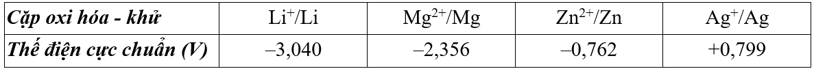 Cho các cặp oxi hóa - khử của các kim loại và thế điện cực chuẩn tương ứng: