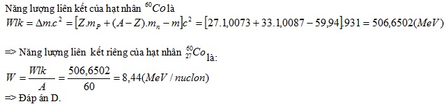có khối lượng là 59,940(u), biết khối lượng proton: 1,0073(u), khối lượng nơtron là 1,0087(u), năng lượng liên kết riêng của hạt nhân