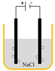 | c) Thứ tự điện phân ở anode là $\text{Cl}^{-}$, H2O và thứ tự điện phân ở cathode là Na+, H2O. | ||