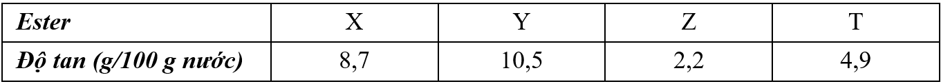 Có 4 ester no, đơn chức, mạch hở đều có công thức cấu tạo dạng R-COO-C2H5 được kí hiệu ngẫu nhiên là X, Y, Z, T. Độ tan của 4 ester được cho ở bảng sau: