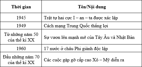| a) Một trong những nhân tố làm cho Trật tự thế giới hai cực I-an-ta bắt đầu rạn nứt là thắng lợi của Cách mạng Trung Quốc (1949). | ||