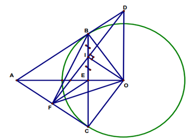 c) Chứng minh tứ giác $FIOC$ nội tiếp, từ đó suy ra $\Delta OFD$ cân tại $O$ nên $I$ là trung điểm $DF$. Do đó $BDEF$ là hình bình hành suy ra $EF//AB$