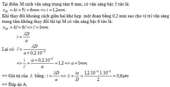 Trong thí nghiệm Y-âng về giao thoa với ánh sáng đơn sắc có bước sóng λ, khoảng cách giữa hai khe hẹp là a, khoảng cách từ mặt phẳng chứa hai khe hẹp đến màn quan sát là 2m. Trên màn quan sát, tại điểm M cách vân sáng trung tâm 6 mm, có vân sáng bậc 5. Khi thay đổi khoảng cách giữa hai khe hẹp một đoạn bằng 0,2 mm sao cho vị trí vân sáng trung tâm không thay đổi thì tại M có vân sáng bậc 6. Giá trị của λ bằng