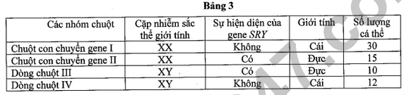 Ở chuột, gene SRY nằm trên nhiễm sắc thể Y có liên quan đến xác định tính đực. Để tìm hiểu vai trò của gene SRY, một nghiên cứu tiến hành tiêm DNA tái tổ hợp chứa gene SRY vào hợp tử chuột cái XX. Gene SRY sẽ gắn ngẫu nhiên lên nhiễm sắc thể của hợp tử. Hợp tử được nuôi phát triển thành phôi sớm và sau đó được cấy vào tử cung của chuột mẹ mang thai sinh ra chuột con chuyển gene. Bảng 3 thể hiện nhiễm sắc thể giới tính, sự hiện diện của gene SRY, kiểu hình giới tính của chuột chuyển gene và một số dòng chuột khác.