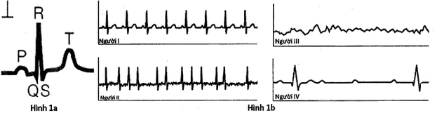 Hình 1b thể hiện điện tâm đồ của bốn người: một người bị block nhĩ thất, một người bị rung thất, một người bị rung nhĩ và một người bình thường.