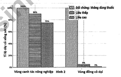 Hình 2 thể hiện ảnh hưởng của thuốc trừ cỏ (Glyphosate) đến tỉ lệ sống sót của quần thể cỏ X ở hai khu vực. Khu vực canh tác nông nghiệp được phun thuốc trừ cỏ thường xuyên và khu vực đồng cỏ dại chưa tiếp xúc với thuốc.