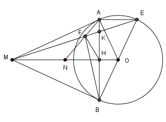 b) Tia $BO$ cắt đường tròn $(O)$ tại điểm $E$ ($E$ khác $A$), đường thẳng $ME$ cắt đường tròn tại $F$ ($F$ khác $B$), đường thẳng $AF$ cắt $MO$tại $N,MO$ cắt $AB$ tại $H$. Chứng minh $\left. \Delta MFN \right.\sim\Delta BFH$ và $N$ là trung điểm của $MH$