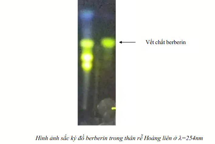 Xác định berberin trong thân rễ Hoàng liên, bằng sắc kí bản mỏng silica gel GF254 trong hệ dung môi ethanol : acetic acid (99 : 1).