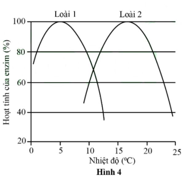 Hai loài cá hồi (Salmonidae) sinh sống trong các suối ở một vùng núi. Kết quả nghiên cứu hoạt tính của một loại enzyme ở 2 loài dưới tác động của nhiệt độ được trình bày ở Hình 4.