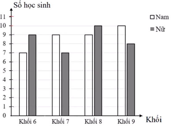 Biểu đồ cột kép biểu diễn số lượng học sinh tham gia giải thi đấu thể thao của một trường trung học cơ sở. Chọn ngẫu nhiên một học sinh tham gia giải thi đấu thể thao của trường đó. Tính xác suất của mỗi biến cố sau: