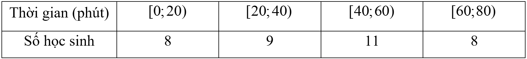 Tú khảo sát thời gian tập thể dục của một số học sinh khối 9 và thu được bảng tần số ghép nhóm như sau: