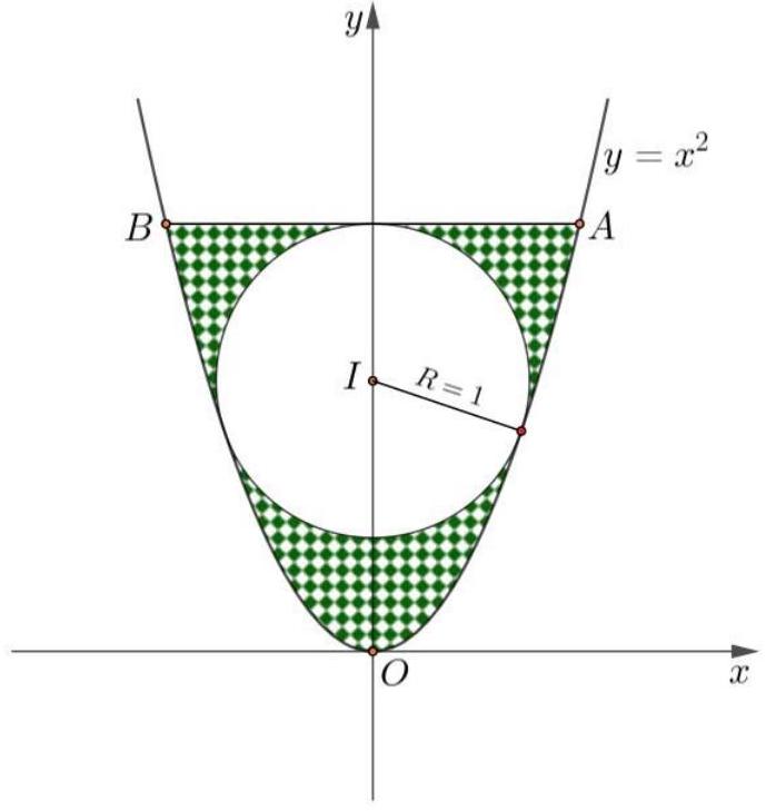 Một khoảng sân của một ngôi nhà có hình dạng là một phần của parabol, nếu chọn hệ trục tọa độ $Oxy$ như hình vẽ bên dưới thì parabol có phương trình là $y = x^{2}$. Chủ nhà muốn thiết kế một hồ nuôi cá cảnh có dạng hình tròn bán kính $1m$, hình tròn được thiết kế tiếp xúc với 2 nhánh của parabol, phía trên của hình tròn ngăn bởi một bức tường mỏng tiếp xúc với hình tròn. Phần đất còn lại của khoảng sân giới hạn bởi đường tròn, 2 nhánh của parabol và bức tường được thiết kế trồng hoa (phần gạch sọc trong hình). Tính diện tích mà chủ nhà thiết kế để trồng hoa, biết rằng đơn vị trên mỗi trục tọa độ là mét. (Kết quả làm tròn đến hàng phần trăm).
