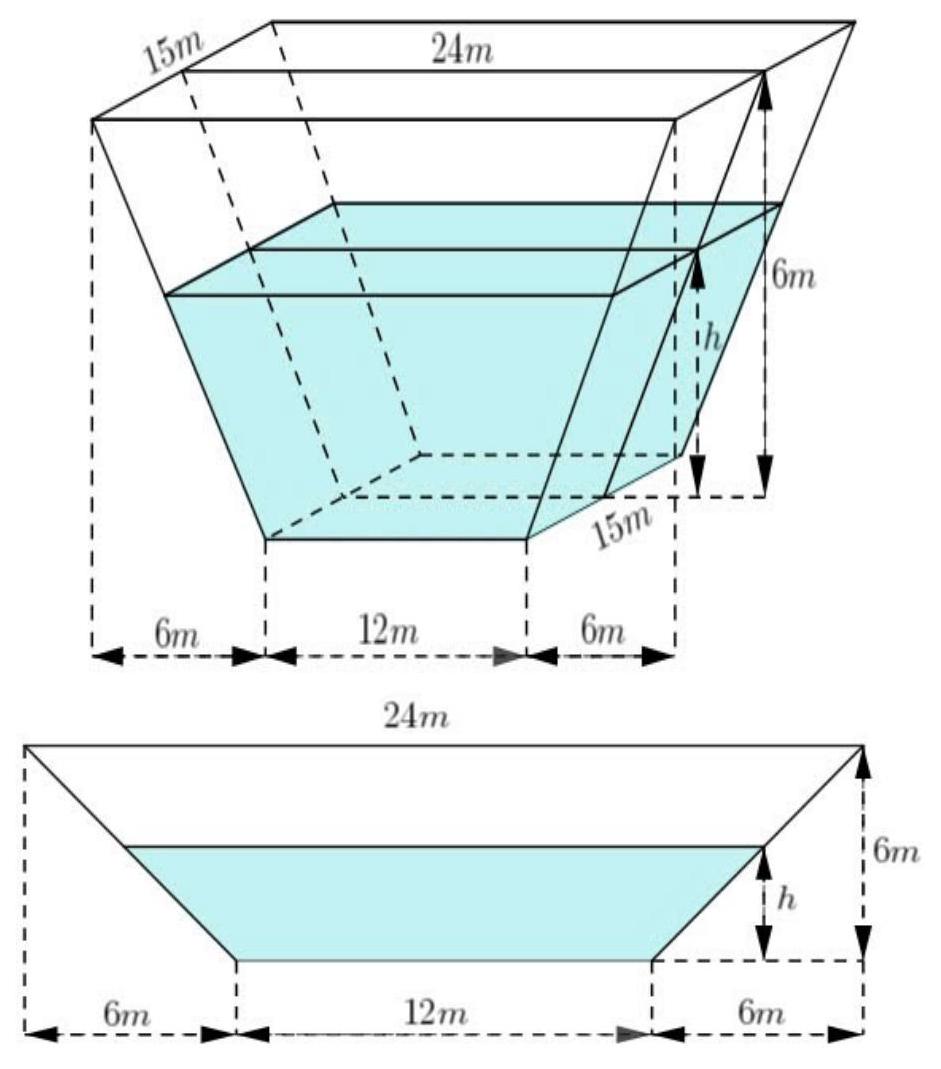 Một bể chứa nước có mặt đáy và miệng bể đều là hình chữ nhật nằm trên 2 mặt phẳng song song với nhau, miệng bể có chiều ngang 15 m và chiều dài 24 m , đáy bể có kích thước $15\text{~m} \times 12\text{~m}$. Độ sâu của bể nước (tính từ miệng đến đáy) là 6 m, mặt cắt vuông góc với chiều ngang của bể có hình dạng là hình thang cân (như hình vẽ). Lúc đầu bể không có nước, người ta sử dụng một máy bơm để bơm nước vào bể với tốc độ $50m^{3}$ trong một phút. Vào lúc mực nước đúng $5m$ thì tốc độ dâng lên của mực nước trong bể là bao nhiêu $m$ trên một phút? (Kết quả làm tròn đến hàng phần trăm).
