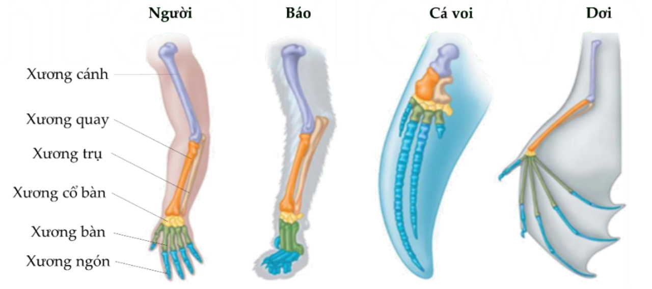 Cấu trúc và hình thái của chi trước một số loài thú được mô tả ở hình bên. Phát biểu nào sau đây phù hợp nhất với hình?