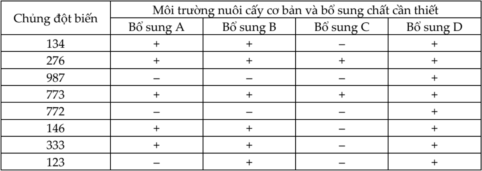Ở một loài vi khuẩn, sự chuyển hóa chất dinh dưỡng D tối cần thiết cho sự sinh trưởng diễn ra theo sơ đồ: Tiền chất (có sẵn) → A, B, C → D. Trong đó có các chất A, B, C có thứ tự chuyển hóa chưa được làm rõ. Quá trình đột biến đã tạo ra một số chủng bị mất khả năng chuyển hóa chất D (do enzyme tham gia giai đoạn nhất định nào đó trong quá trình chuyển hóa bị mất hoạt tính). Kết quả nghiên cứu các chủng đột biến (được kí hiệu bằng các chữ số) trong các môi trường nuôi cấy có bổ sung một trong 4 chất A, B, C, D được thể hiện ở bảng:
