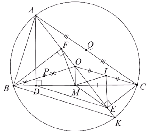 Cho đường tròn $(O)$ và dây $BC$cố định không đi qua $O$. Trên cung lớn $BC$ lấy điểm $A$ sao cho $AB < AC$. Dựng đường kính $AK,E$ là hình chiếu của $C$ trên $AK$. Gọi $M$ là trung điểm của $BC$.