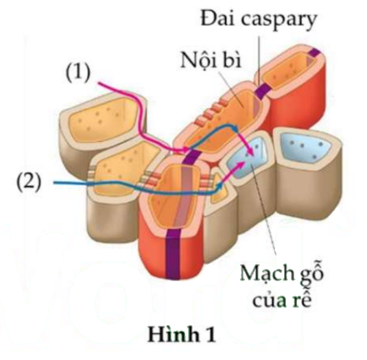 Thực vật trên cạn, con đường vận chuyển nước và ion khoáng từ đất vào mạch gỗ của rễ được minh họa như Hình 1. Kí hiệu con đường (1) và (2) lần lượt là: