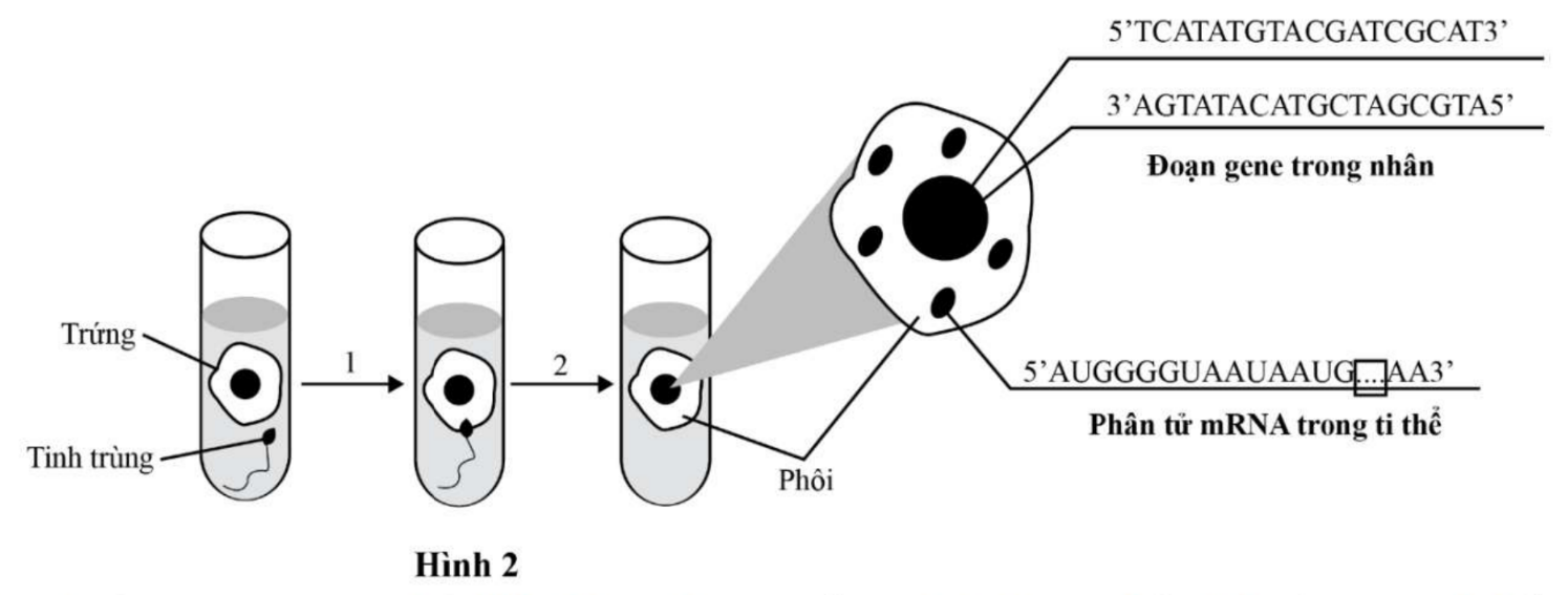 Phương pháp IVF “thụ tinh trong ống nghiệm” ở Việt Nam đã mất hơn 10 năm để chuẩn bị do hạn chế về cơ sở vật chất, kỹ thuật, nhân lực chuyên môn. Đến ngày 30/4/1998, đánh dấu mốc quan trọng cho IVF Việt Nam, 3 em bé IVF đầu tiên của Việt Nam được chào đời. Hình 2 mô tả khái quát về một số bước có trong phương pháp trên. Ngoài ra, phương pháp IVF còn phân tích được một đoạn gene trong nhân có chứa bộ ba thứ nhất mã hóa amino acid trên mạch khuôn quy định mã mở đầu và một phân tử mRNA trong ti thể của phôi sau khi thụ tinh. Nhận định nào sau đây là đúng?