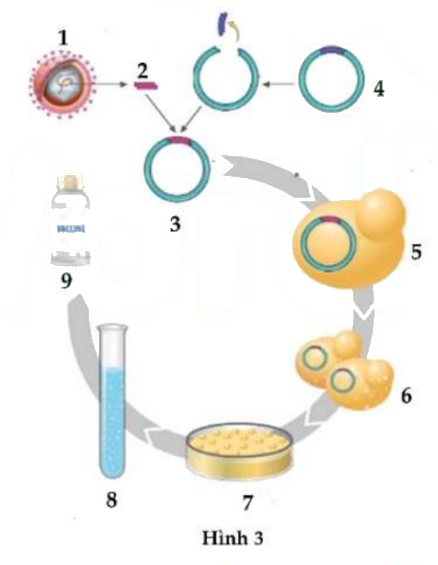 Hình 3 mô tả quá trình sản xuất vaccine phòng bệnh viêm gan B do virus Hepatitis B gây ra. Theo lí