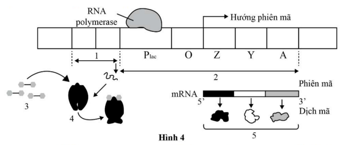 Hình 4 mô tả cơ chế điều hòa biểu hiện gene ở Operon Lac của vi khuẩn E.coli trong môi trường có lactose. Khi môi trường có lactose, protein ức chế sẽ không bám vào được vùng O, RNA polymerase liên kết vào P, nhờ đó quá trình phiên mã và dịch mã xảy ra tổng hợp nên các enzyme giúp vi khuẩn chuyển hóa và sử dụng đường lactose. Enzyme này tương ứng với vị trí nào trên Hình 4?