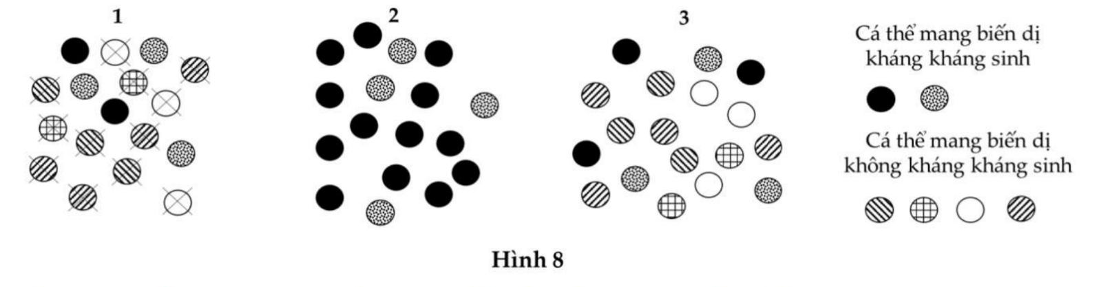 Hình 8 mô tả ba giai đoạn của quá trình hình thành các chủng vi khuẩn kháng kháng sinh, theo học thuyết tiến hóa của Darwin về chọn lọc tự nhiên và hình thành loài.