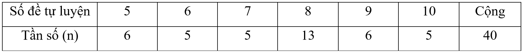 Cô giáo thống kê số đề tự luyện môn Toán mà 40 học sinh lớp 9B hoàn thành trong 1 tháng như sau: