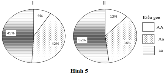 Hình 5 thể hiện tỉ lệ các loại kiểu gene qui định màu lông của hai quần thể động vật thuộc cùng một loài, allele A qui định lông trắng trội hoàn toàn so với allele a qui định lông đen, gene nằm trên nhiễm sắc thể thường.