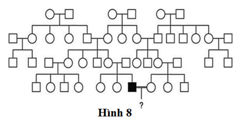 Một dạng bệnh điếc ở người do đột biến gene trên nhiễm sắc thể giới tính gây ra. Một người đàn ông mắc dạng điếc này kết hôn với một người phụ nữ bình thường. Họ phát hiện giữa họ có mối quan hệ họ hàng xa với nhau. Một phần cây phả hệ được ghi lại ở Hình 8.