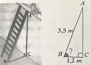 Một cái thang có chiều dài $AB = 3,5m$ đặt gác lên môt bức tường sao cho chân thang cách chân tường một khoảng $BC = 1,2~m$ (như hình minh họa). Góc tạo bởi cái thang AB và phương nằm ngang BC bằng (kết quả làm tròn đến độ)