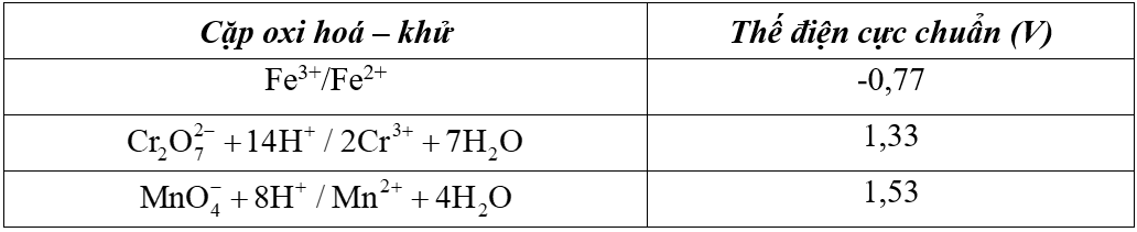 | d) Trong môi trường acid, anion $Cr_{2}O_{7}^{2 -}$ (từ sự phân li của muối potassium dichromate, K2Cr2O7) có tính oxi hoá mạnh hơn anion $MnO_{4}^{-}$ (từ sự phân li của muối KMnO4). |