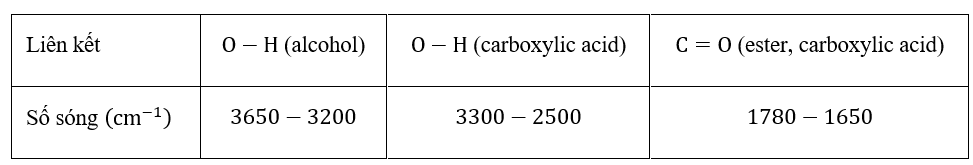 Sau thí nghiệm, tiến hành phân tách sản phẩm. Ghi phổ hồng ngoại của acetic acid, isoamyl alcohol và isoamyl acetate. Cho biết số sóng hấp thụ đăc trung của một số liên kết trên phổ hồng như sau: