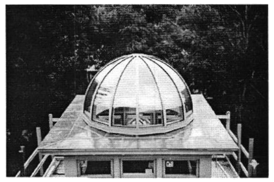 Một mái vòm kính có hình dạng nửa hình cầu được đặt trên một tòa nhà, như trong hình.