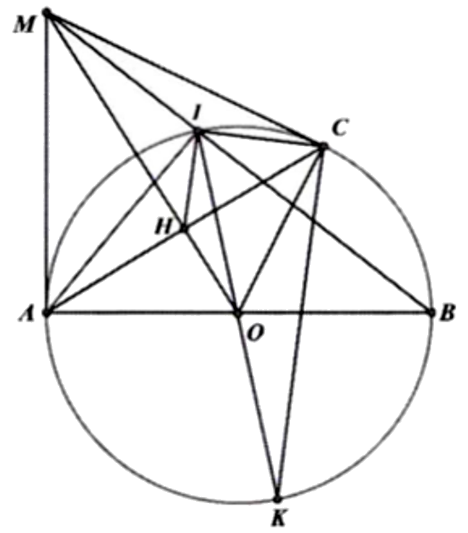b) Chứng minh $MO\bot AC$ nên $\Delta MAO$ và $\Delta MHA$ là hai tam giác đồng dạng, từ đó suy ra đpcm.