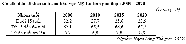 | c) Dạng biểu đồ thích hợp nhất thể hiện sự chuyển dịch cơ cấu dân số theo nhóm tuổi ở khu vực Mỹ la tinh giai đoạn 2000 – 2020 là biểu đồ miền. | ||