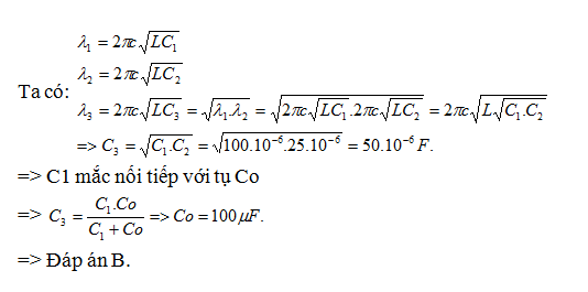 Một mạch chọn sóng có L không đổi. Khi tụ là C1 = 100 μF thì mạch thu được sóng λ1 , khi tụ là C2 = 25 μFthì mạch thu được sóng λ2. Nếu mạch có tụ C1 ghép với tụ C0 thì mạch thu được sóng λ3 =