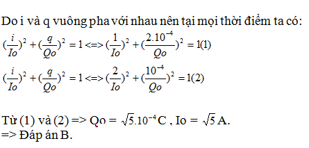 Một mạch dao động LC. Khi cường độ dòng điện là 1 A thì điện tích trên tụ là 2.10-4 C, Khi cường độ dòng điện là 2 A thì điện tích trên tụ là 10-4 C. Tìm cường độ dòng điện cực đại trong mạch?