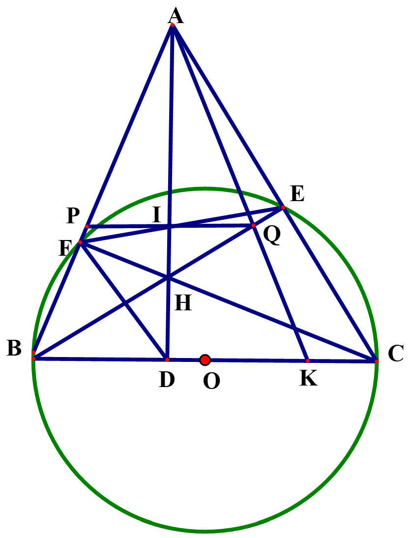 Cho nửa đường tròn (O) đường kính BC. Trên cung BC lấy các điểm F, E (F thuộc cung BE; E, F khác B và C); đường thẳng BF và CE cắt nhau tại A; BE và CF cắt nhau tại H; đường thẳng AH cắt EF và BC lần lượt tại I và D. Đường thẳng qua I song song với BC cắt $AB,BE$ lần lượt tại P, Q. Tia AQ cắt BC tại K.