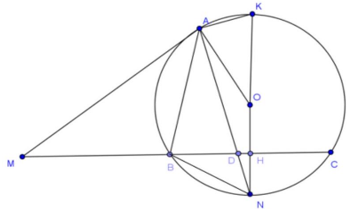 Từ điểm $M$ nằm ngoài đường tròn $\left( {O;R} \right)$ kẻ đường thẳng $d$ không đi qua tâm $O$ cắt đường tròn tại hai điểm $B,C$ (điểm $B$ nằm giữa hai điểm $M$ và $C$) và tiếp tuyến $MA$ ($A$ là tiếp điểm). Gọi $H$ là trung điểm $BC$. Đường thẳng $OH$ cắt đường tròn $\left( {O;R} \right)$ tại hai điểm $NK$ (trong đó điểm $K$ thuộc cung $BAC$). Gọi $D$ là giao điểm của $AN$ và $BC$.
