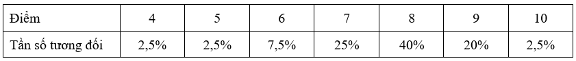 Cho bảng tần số tương đối điểm kiểm tra cuối năm môn Toán của 40 học sinh lớp 9, trường THCS X như sau.