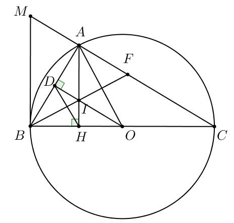 b) Điểm I là giao điểm của các đường thẳng AH và OD. Đường thẳng BI cắt đường thẳng AC tại điểm F. Tiếp tuyến tại B của đường tròn $(O)$ cắt đường thẳng AC tại điểm M. Chứng minh $AB^{2} = AH.BM$ và $AM = AF$