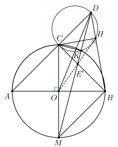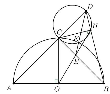 c) Đường tròn ngoại tiếp tam giác CDH cắt nửa đường tròn đường kính AB tại điểm K (K không trùng với C). Chứng minh DE > 2.CK