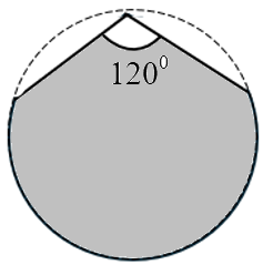 Người ta muốn trang trí bức tường với họa tiết có dạng là một phần cùa hình tròn bán kính $1,5~\text{m}$ bằng cách sử dụng đèn dây trang trí phần viền. Biết rằng họa tiết được cấu tạo bởi hai đoạn thẳng cùng độ dài tạo với nhau một góc $120^{0}$ và một cung tròn như hình vẽ dưới đây. Độ dài (làm tròn đến hàng phần chục của mét) đoạn dây đèn dùng trang trí là