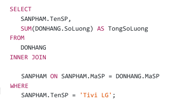 c) Để xem số lượng sản phẩm “Tivi LG” đã bán được bao nhiêu ta thực hiệnCâu lệnh sau:![]() |