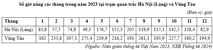 Căn cứ vào bảng số liệu trên, tổng số giờ nắng các tháng trong năm 2023 tại trạm quan trắc Vũng Tàu nhiều hơn tại trạm quan trắc Hà Nội (Láng) là bao nhiêu giờ? (Làm tròn kết quả đến hàng đơn vị)