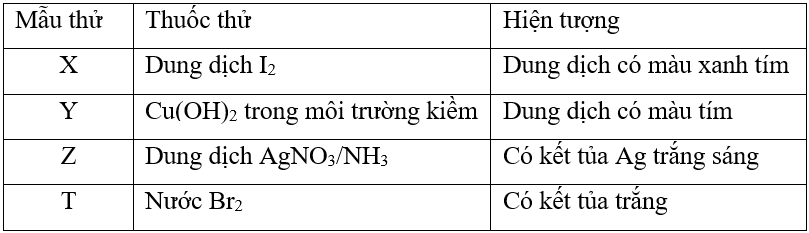 Thực hiện các thí nghiệm đối với các chất X, Y, Z, T thu được các hiện tượng dưới