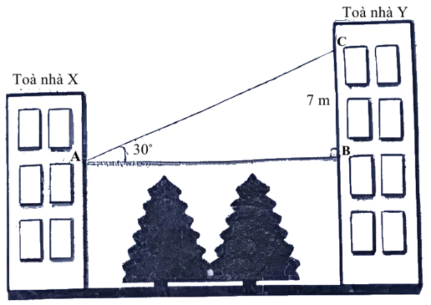 b) Để thực hành đo khoảng cách giữa hai tòa nhà X và Y, một học sinh dùng giác kế tại vị trí A của tòa nhà X và ngắm qua hai vị trí B, C của tòa nhà Y như hình vẽ. Khoảng cách giữa hai điểm B, C (ở hai tầng) bằng 7 m, $\angle BAC = 30^{o}$, vị trí A và B cùng độ cao so với mặt đất. Tính khoảng cách AB giữa hai tòa nhà đó (kết quả làm tròn đến chữ số thập phân thứ nhất của đơn vị mét).