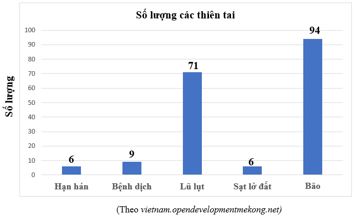 c) Hình bên là biểu đồ số lượng các thiên tai xảy ra tại Việt Nam giai đoạn 1990-2021. Biểu đồ có bao nhiều loại thiên tai và loại thiên tại nào xảy ra nhiều nhất?